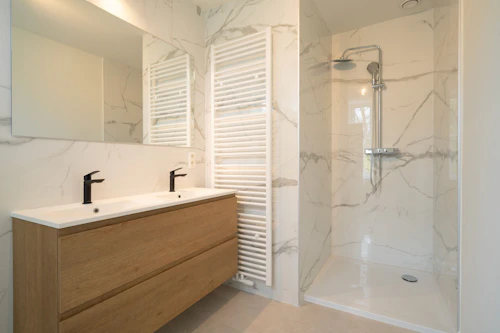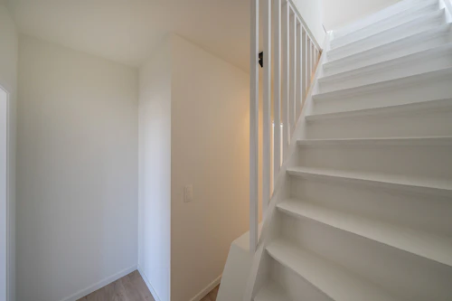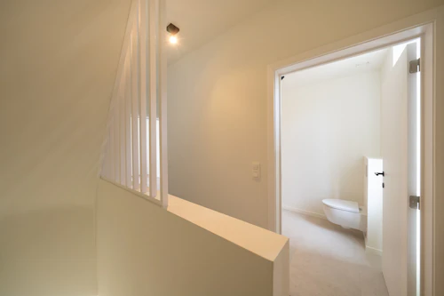 nachthall met vaste trap naar de tweede verdieping, ruime slaapkamer 1 (15,2m²), stijlvolle badkamer met inloopdouche, meubel met 2 wastafels en tweede hang-WC