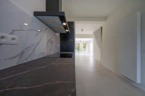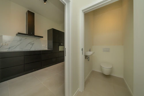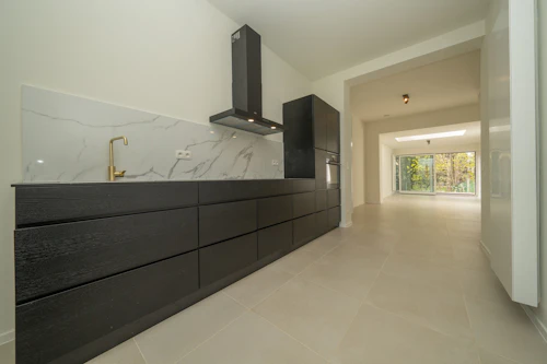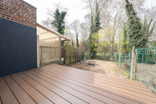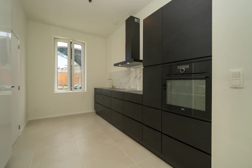 inkomhall, hang-WC met wastafeltje, open, ingerichte keuken (10m²) van het merk KVIK, lichtrijke leefruimte (32m²) met schuifraam uitgevend op de stadstuin, nieuw terras (zowel betonnen sokkel als vloerafwerking zijn volledig nieuw), stadstuin met zicht op de Zenne en het Albertpark, nieuwe regenwaterput (5.000l), nieuwe septische put (3.000l), nieuwe verliesput (1.500l)