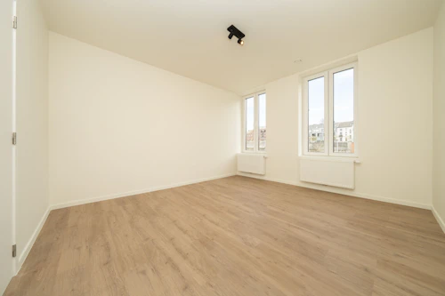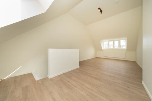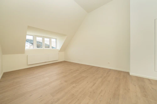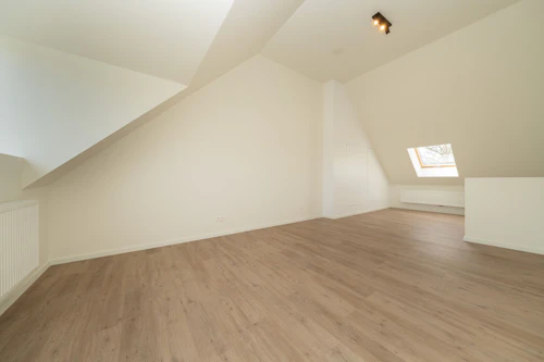 ruime slaapkamer 2 (30m²) mogelijk op te splitsen in 2 kamers of te voorzien van een hoogslaper dankzij de hoge plafonds, ingebouwde kasten waarin de technieken zijn ondergebracht (ventilatiesysteem & centrale verwarming)