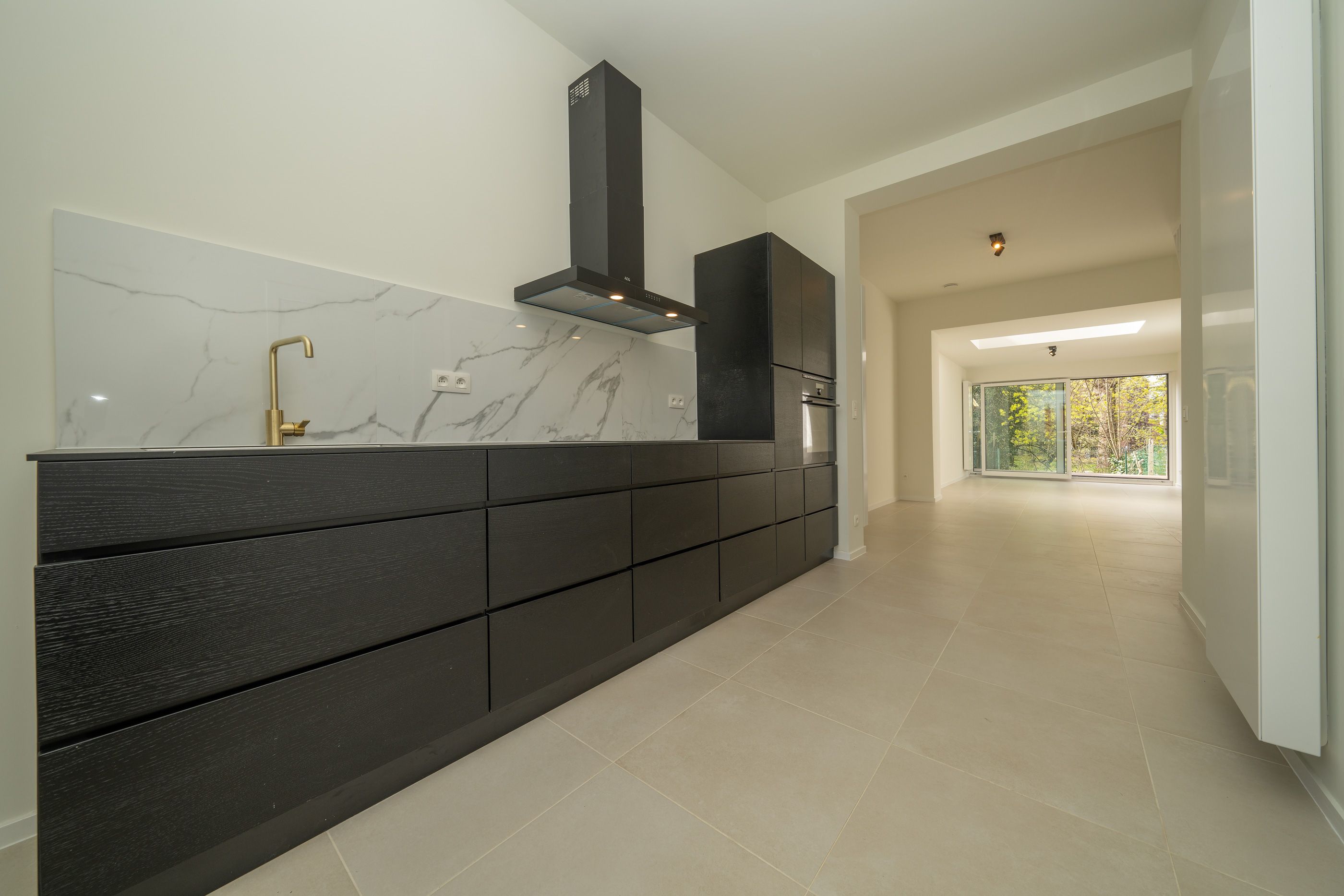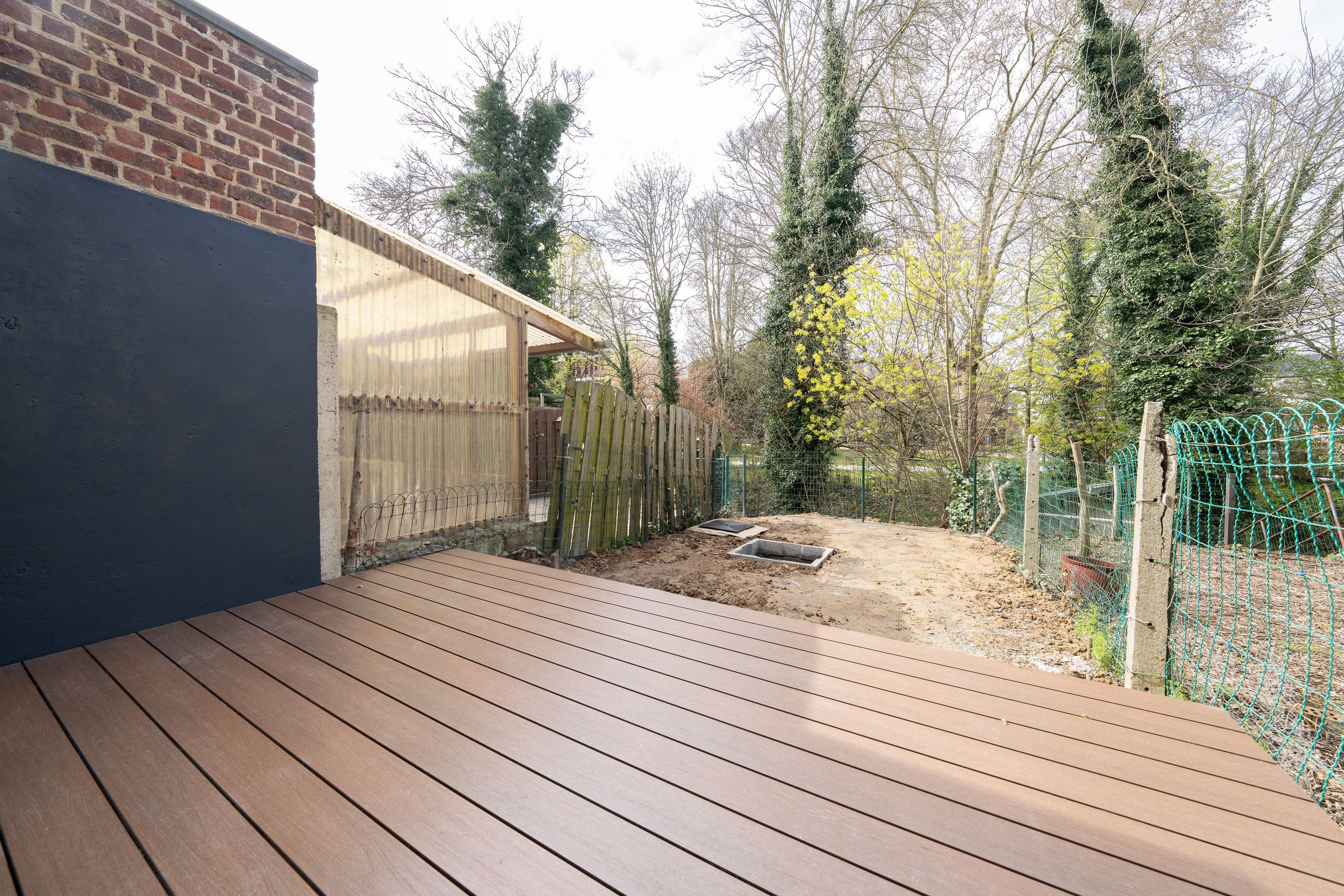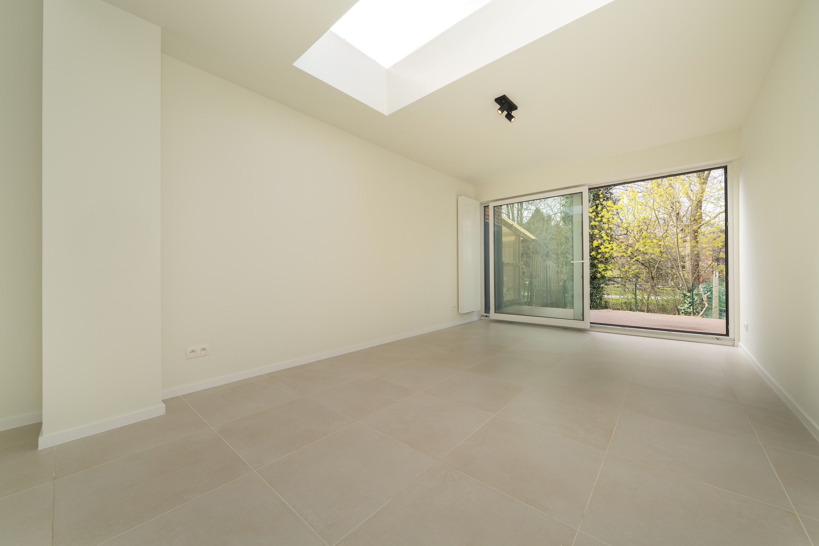 inkomhall, hang-WC met wastafeltje, open, ingerichte keuken (10m²) van het merk KVIK, lichtrijke leefruimte (32m²) met schuifraam uitgevend op de stadstuin, nieuw terras (zowel betonnen sokkel als vloerafwerking zijn volledig nieuw), stadstuin met zicht op de Zenne en het Albertpark, nieuwe regenwaterput (5.000l), nieuwe septische put (3.000l), nieuwe verliesput (1.500l)