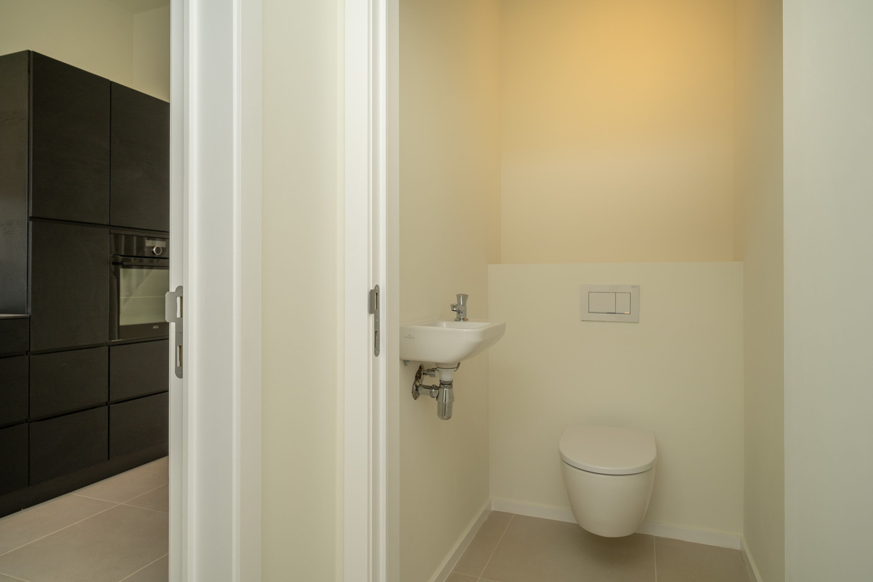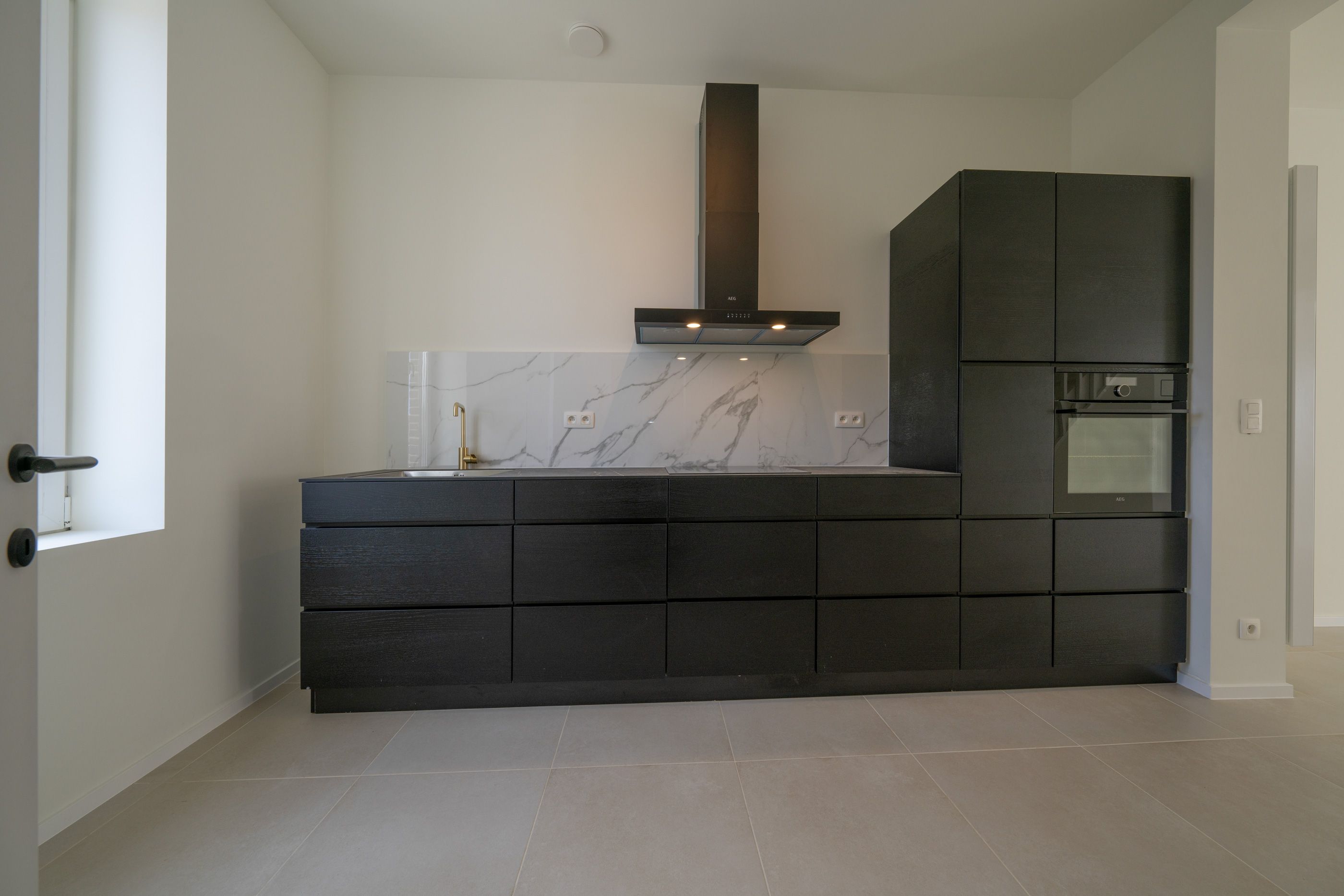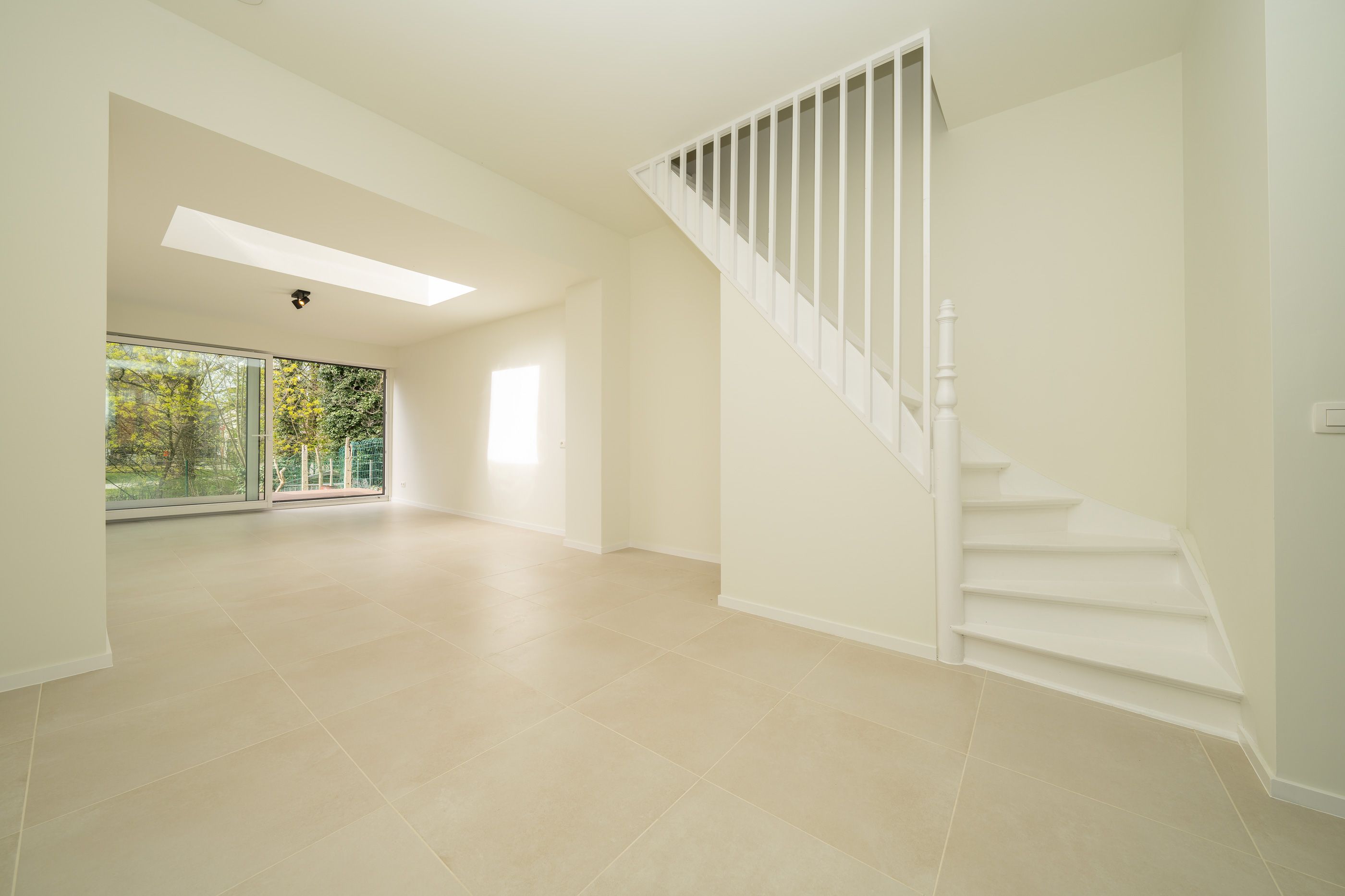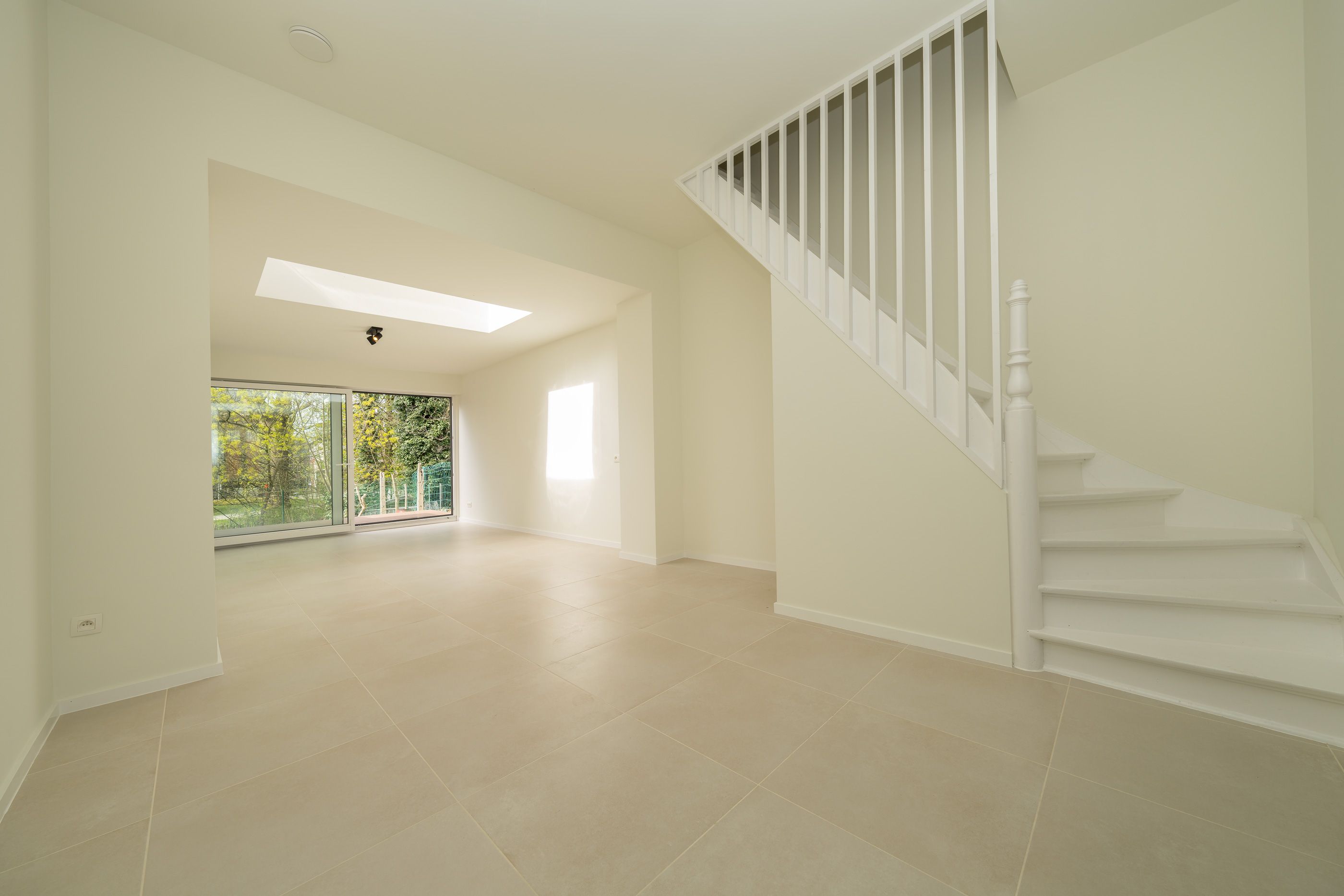 inkomhall, hang-WC met wastafeltje, open, ingerichte keuken (10m²) van het merk KVIK, lichtrijke leefruimte (32m²) met schuifraam uitgevend op de stadstuin, nieuw terras (zowel betonnen sokkel als vloerafwerking zijn volledig nieuw), stadstuin met zicht op de Zenne en het Albertpark, nieuwe regenwaterput (5.000l), nieuwe septische put (3.000l), nieuwe verliesput (1.500l)