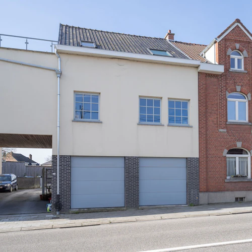 privatieve Inkomhall (1m00x3m20), vestiaire (0m75x1m90), garage 1 (3m05x3m90) met elektrisch bediende poort, garage 2 (3m25x5m70) met elektrisch bediende poort