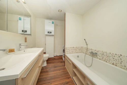 Individuele, centrale gasverwarming met condensatieketel (2025), dubbele beglazing (PVC), badkamer vernieuwd in 2025, geen lift, geen syndicus, geen gemeenschappelijke lasten, vrij vanaf 1 augustus 2026, verkoop onder registratierechten: mogelijkheid 2% onder voorwaarden