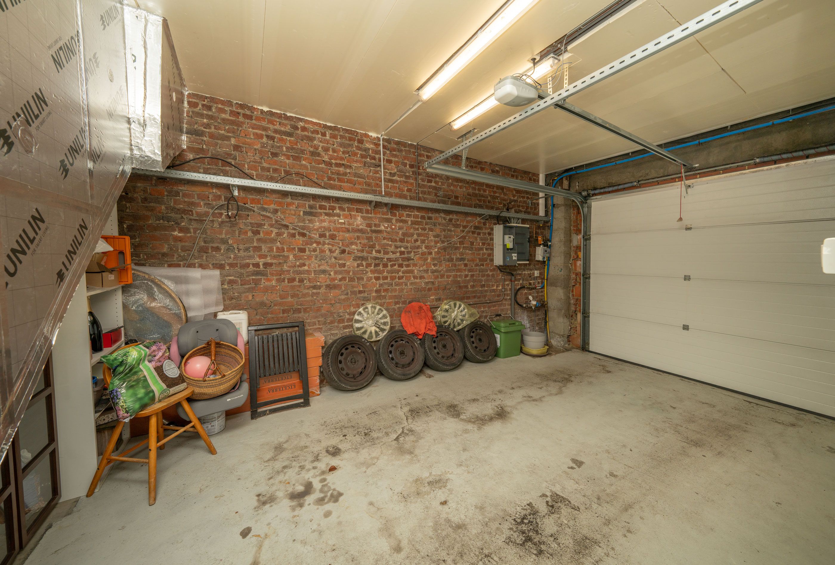 privatieve Inkomhall (1m00x3m20), vestiaire (0m75x1m90), garage 1 (3m05x3m90) met elektrisch bediende poort, garage 2 (3m25x5m70) met elektrisch bediende poort