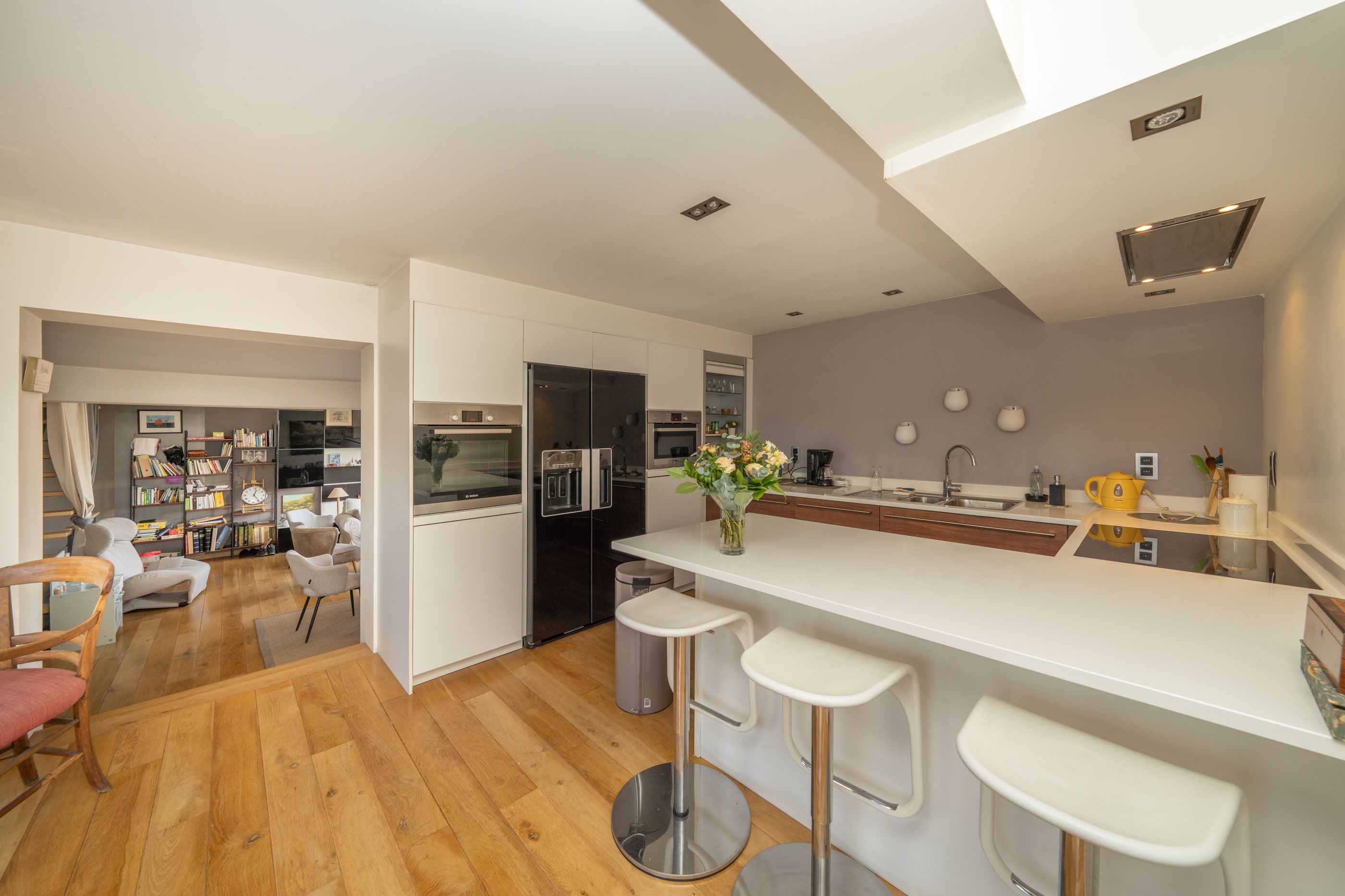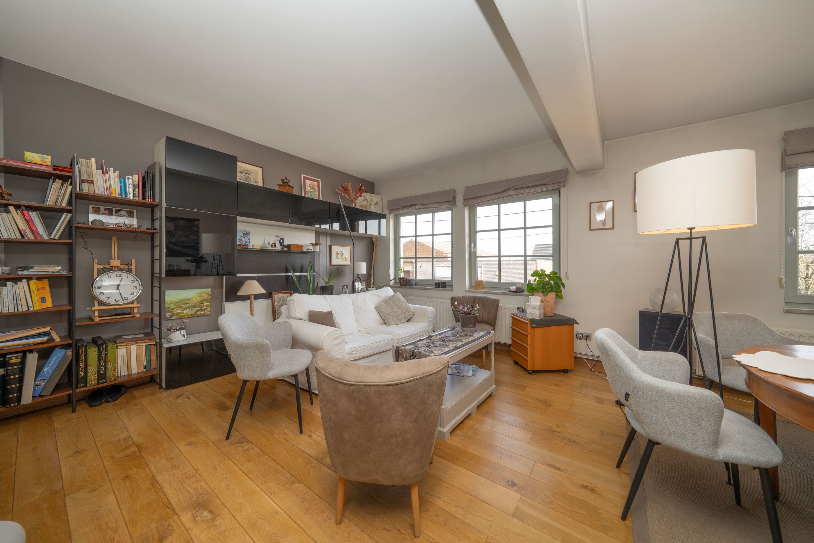 lichtrijke leefruimte (5m80x6m50) met pelletkachel en trap naar de tweede verdieping, volledig ingerichte keuken voorzien van een composieten werkblad en een eiland met eet-/barfunctie, badkamer (2m20x3m65) met ligbad, aparte douche, meubel met 2 wastafels, WC en stookketel